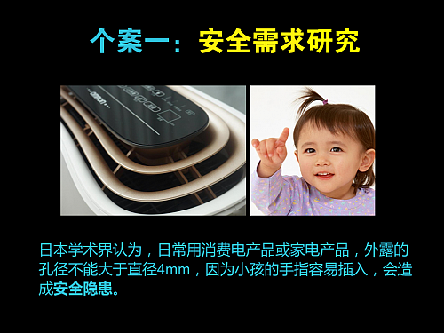 我給大家分享幾個(gè)案例,一個(gè)是安全需求,日本學(xué)術(shù)界認(rèn)為,家用電器類產(chǎn)品,如果上面有孔徑的,孔徑的直徑不能大于4mm,因?yàn)楹芸赡芗抑杏行『ⅲ@個(gè)世界對(duì)于小孩來講是全新的,產(chǎn)品上的聲光電等都會(huì)讓小孩子產(chǎn)生好奇心,難免會(huì)用手指頭去觸摸,這樣就很容易造成安全隱患。不管是大人小孩,人都是會(huì)犯錯(cuò)誤的,所以我們?cè)谠O(shè)計(jì)之初就要考慮這些,在用戶沒有正常使用產(chǎn)品的情況下,也盡量避免意外事故的發(fā)生。