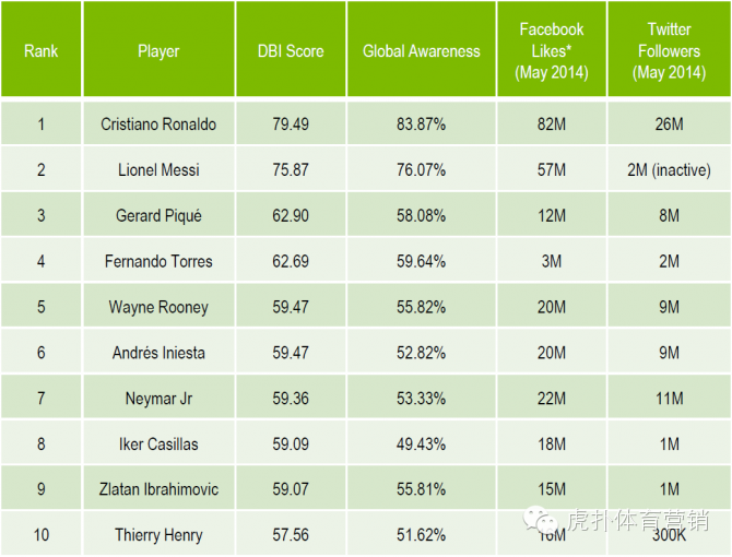 耐克贊助的葡萄牙人克·羅納爾多(C羅)以86%的全球知名度領(lǐng)銜該排行榜。而2013年一年印有他名字的球衣就賣了超過100萬件。阿迪贊助的梅西的全球知名度為76%,位居第二。 Repucom認為,C羅在社交網(wǎng)絡(luò)上的活躍有助于提升其市場價值。C羅在推特(Twitter)上已經(jīng)有2600萬粉絲,而“寡言的”梅西則只有200萬追隨者。